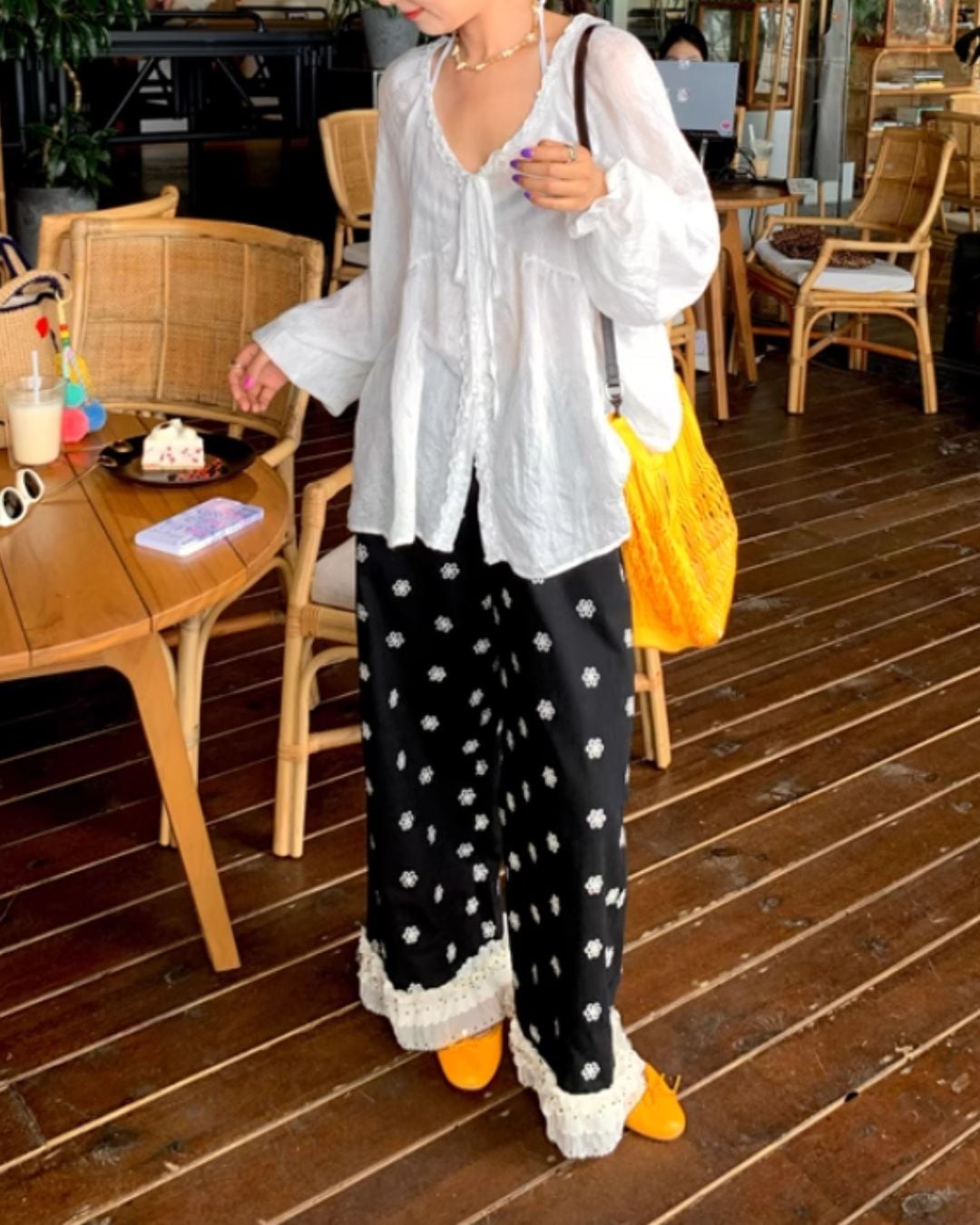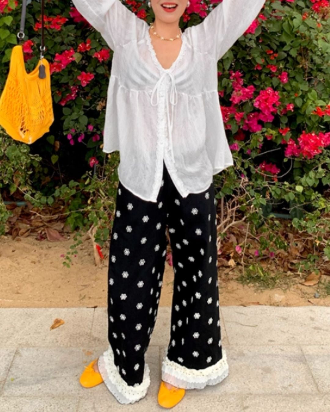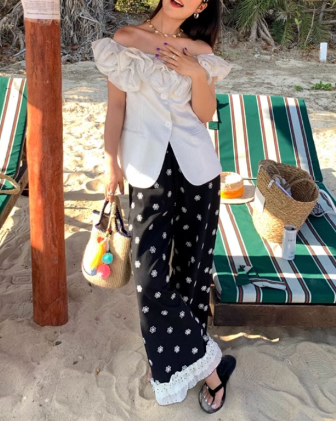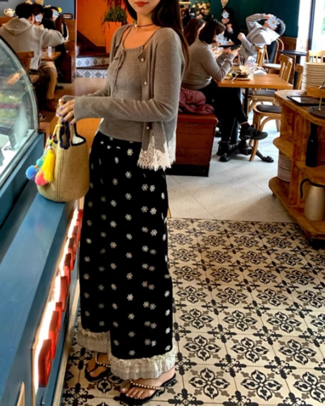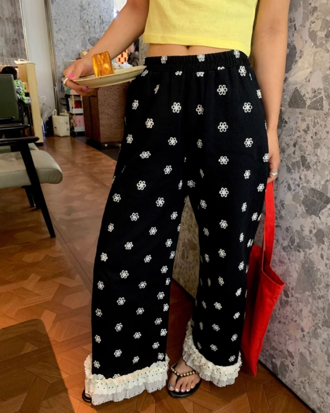 Daisy Embroidery Flare Silhouette Wide Pants P0034