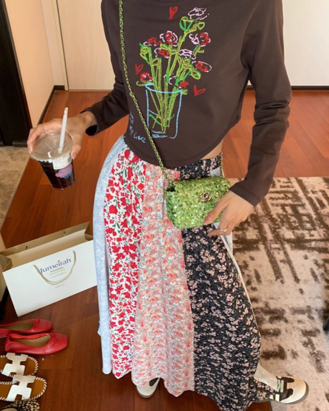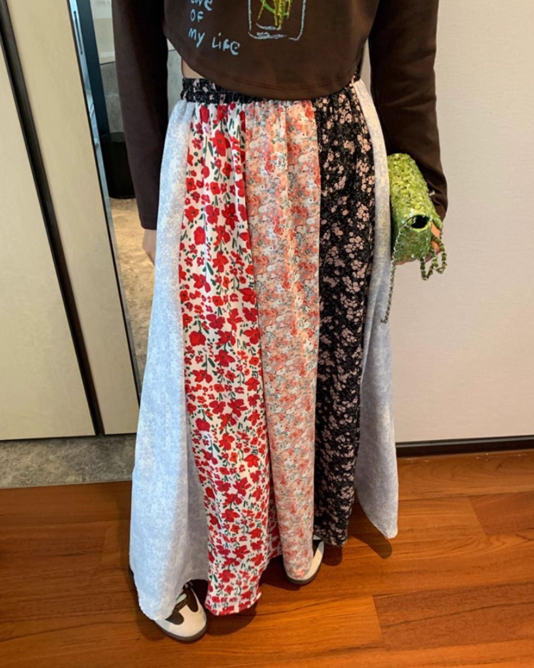 パッチワークデザインのワイドレッグロングスカート。異なる花柄の生地を組み合わせた、個性的なデザインが魅力的なアイテムです